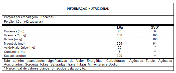 Contém ingredientes como Proteínas, Vitamina C, Biotina, Magnésio, Ácido hialurônico, Curcumina e Saponinas.
