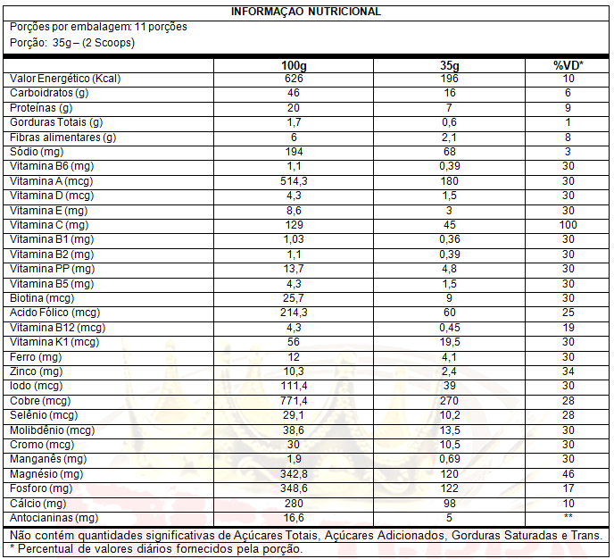 Substitui o parcial de refeição com baixo índice glicêmico. Contém proteínas de alto valor biológico, fibras, vitaminas e minerais. Auxilia no metabolismo energético.
